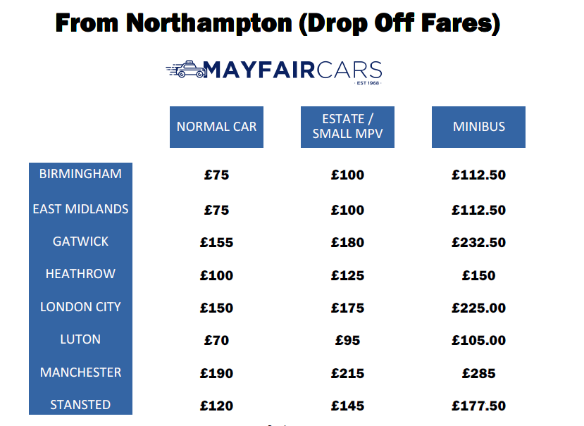 The prices listed are for a single journey only so if you want a trip from an address within Northampton to Birmingham Airport in a standard car then the cost would be £75.00, and when you return the cost for a standard car from Birmingham back to an address within Northampton would be £80.00.