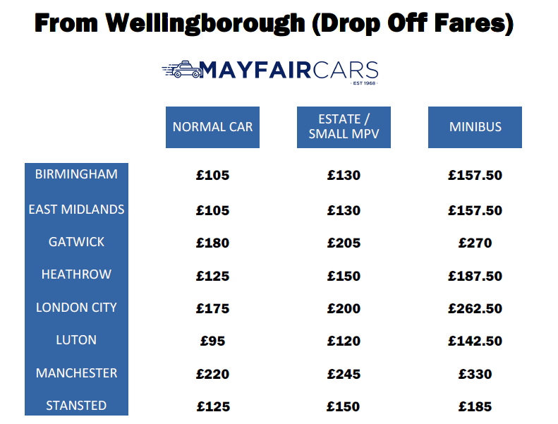 The prices listed are for a single journey only so if you want a trip from an address within Wellingborough to Birmingham Airport in a standard car then the cost would be £105, and when you return the cost for a standard car from Birmingham back to an address within Wellingborough would be £110.